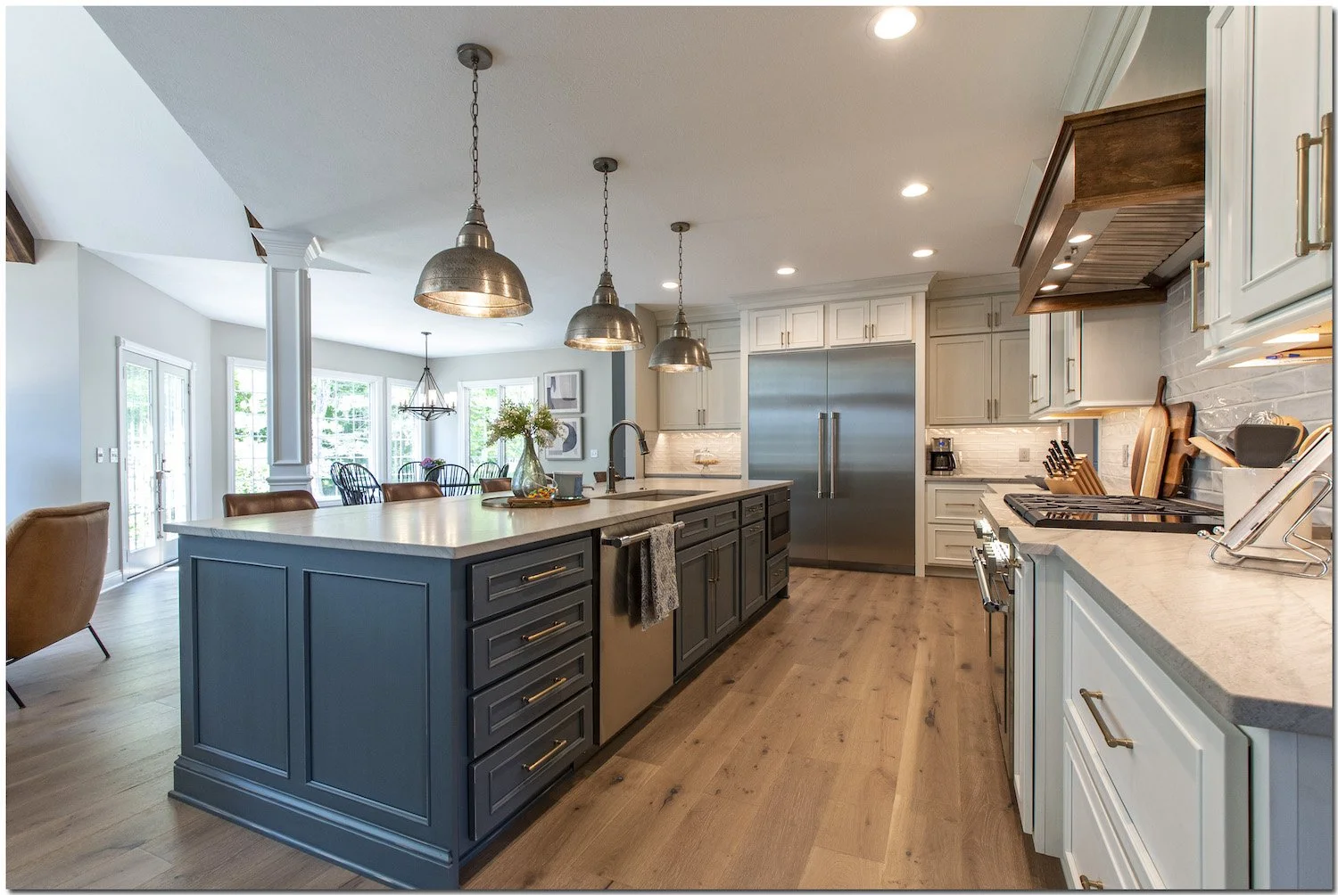 Think of this design move as a way to “anchor” down the visual appeal of your kitchen. Foundation color shades range depending on your preferences, from soft whites, pastels and cream tones to bolder options like warm wood and even deeper navy.
